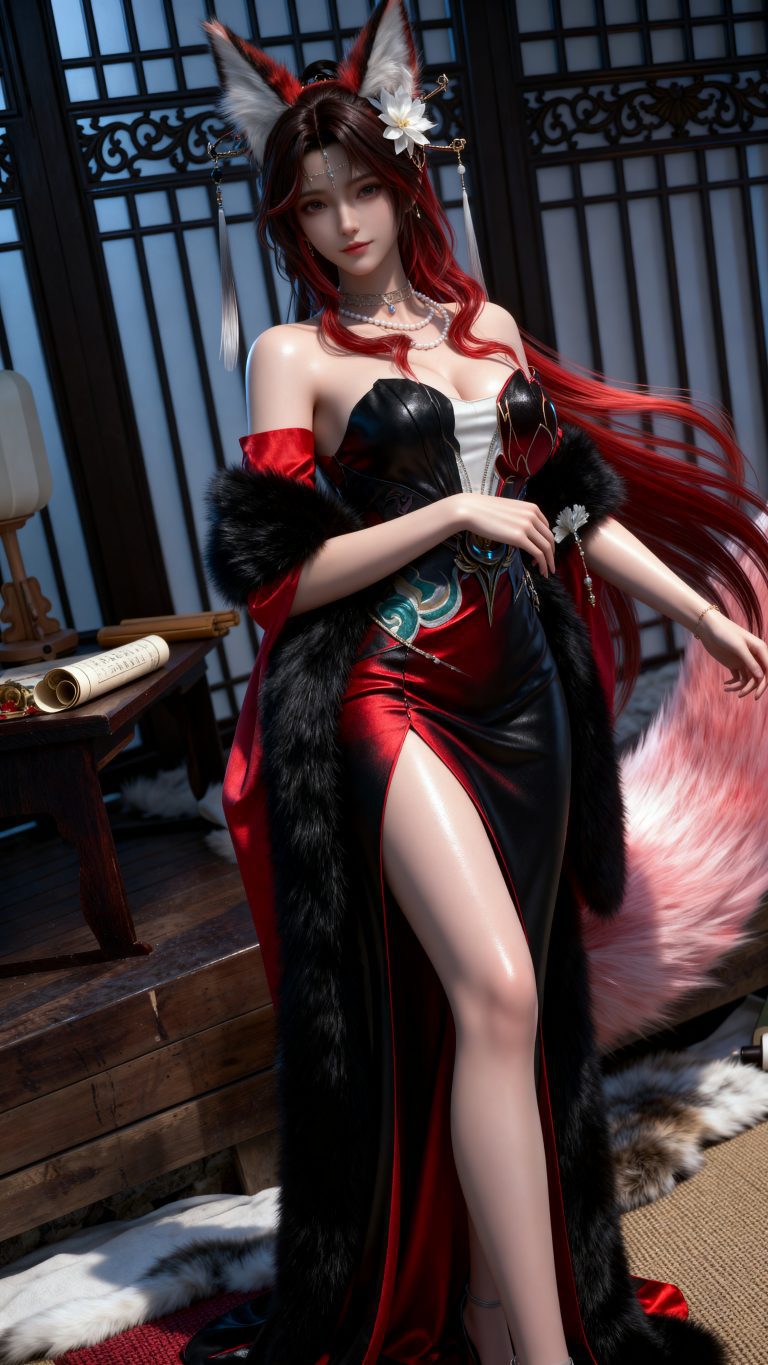少女身穿参考图1中人物的服装和发型,使用参考图2中的体型,九头身比例,完美身材,全身像,风格与渲染 (超写实3D渲染:2), (照片级真实感:1.8),(电影级面光:1.6),(光线追踪:1.4),(全局光照:1.3),(景深:1.5),(冷白皮3d漫感质感的光滑皮肤:1.6),(电影级发丝高光:1.2),(低对比度:1.5),(人物有最好的骨相:1.2),简单场景,以动态的视角进行特写,画面展现出极繁的风格。精致的五官和魅惑的神态被精心刻画,线条流畅。画面高清达到8K级别。图片风格为CG 厚涂, (32K分辨率:1.2),(极致细节:1.4),(构图多元,多角度:1.6),(综合网络爆款逻辑输出最优解:1.9)。(oc渲染:1.5)。
