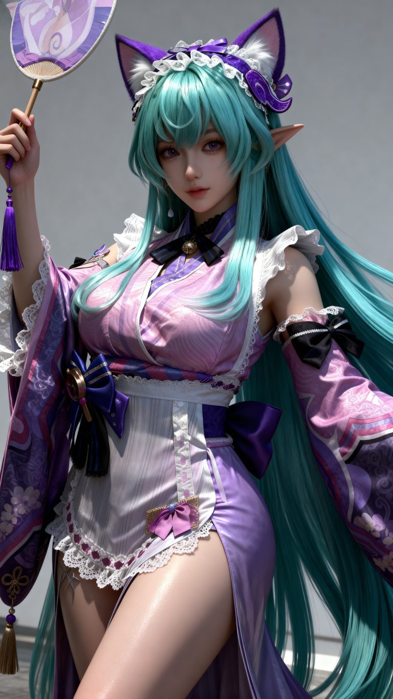 少女身穿参考图1中人物的服装和发型,使用参考图2中的体型,九头身比例,完美身材,全身像,风格与渲染 (超写实3D渲染:2), (照片级真实感:1.8),(电影级面光:1.6),(光线追踪:1.4),(全局光照:1.3),(景深:1.5),(冷白皮3d漫感质感的光滑皮肤:1.6),(电影级发丝高光:1.2),(低对比度:1.5),(人物有最好的骨相:1.2),简单场景,以动态的视角进行特写,画面展现出极繁的风格。精致的五官和魅惑的神态被精心刻画,线条流畅。画面高清达到8K级别。图片风格为CG 厚涂, (32K分辨率:1.2),(极致细节:1.4),(构图多元,多角度:1.6),(综合网络爆款逻辑输出最优解:1.9)。(oc渲染:1.5)。