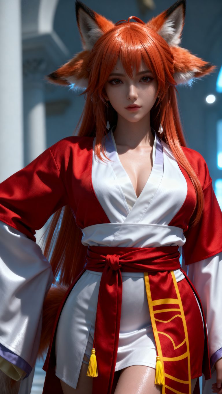 少女身穿参考图1中人物的服装和发型,使用参考图2中的体型,九头身比例,完美身材,全身像,风格与渲染 (超写实3D渲染:2), (照片级真实感:1.8),(电影级面光:1.6),(光线追踪:1.4),(全局光照:1.3),(景深:1.5),(冷白皮3d漫感质感的光滑皮肤:1.6),(电影级发丝高光:1.2),(低对比度:1.5),(人物有最好的骨相:1.2),简单场景,以动态的视角进行特写,画面展现出极繁的风格。精致的五官和魅惑的神态被精心刻画,线条流畅。画面高清达到8K级别。图片风格为CG 厚涂, (32K分辨率:1.2),(极致细节:1.4),(构图多元,多角度:1.6),(综合网络爆款逻辑输出最优解:1.9)。(oc渲染:1.5)。
