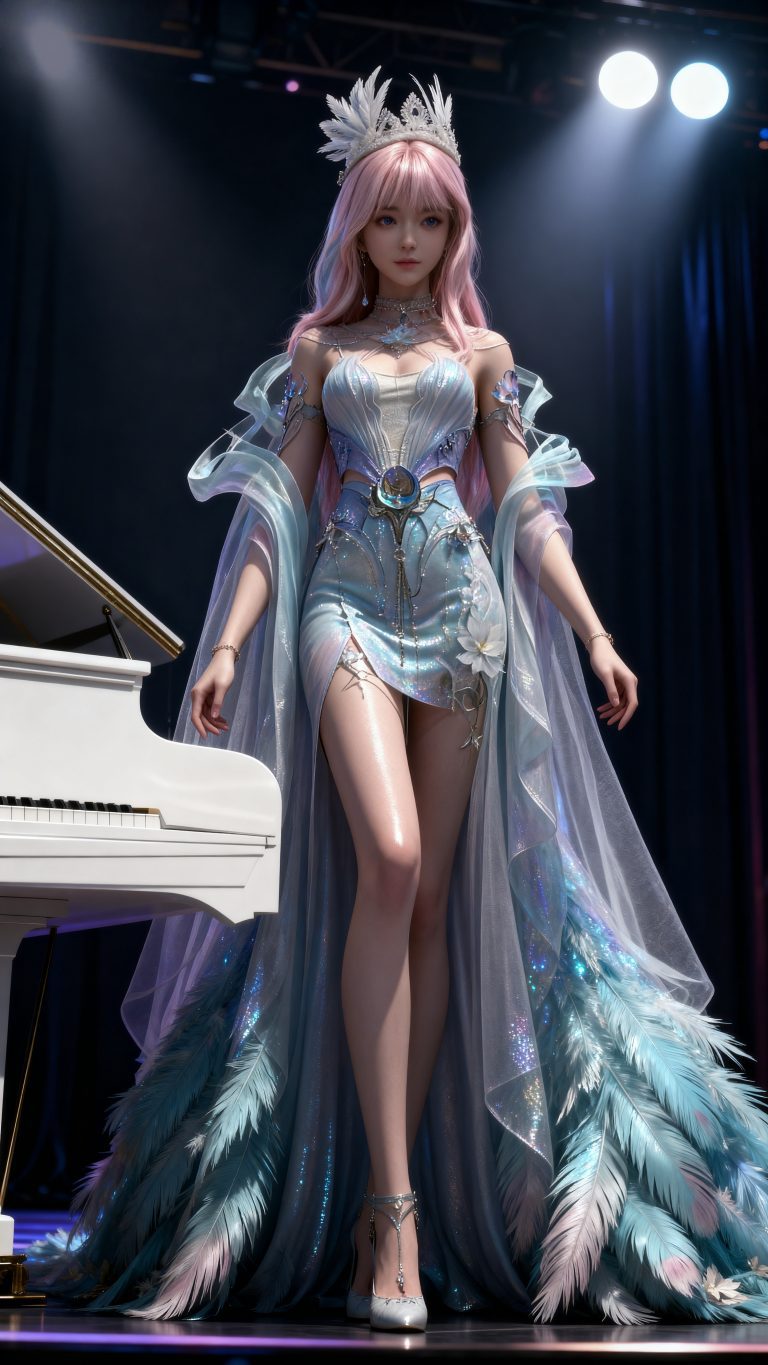 少女身穿参考图1中人物的服装和发型,使用参考图2中的体型,九头身比例,完美身材,全身像,风格与渲染 (超写实3D渲染:2), (照片级真实感:1.8),(电影级面光:1.6),(光线追踪:1.4),(全局光照:1.3),(景深:1.5),(冷白皮3d漫感质感的光滑皮肤:1.6),(电影级发丝高光:1.2),(低对比度:1.5),(人物有最好的骨相:1.2),舞台场景,以动态的视角进行特写,画面展现出极繁的风格。精致的五官和魅惑的神态被精心刻画,线条流畅。画面高清达到8K级别。图片风格为CG 厚涂, (32K分辨率:1.2),(极致细节:1.4),(构图多元,多角度:1.6),(综合网络爆款逻辑输出最优解:1.9)。(oc渲染:1.5)。