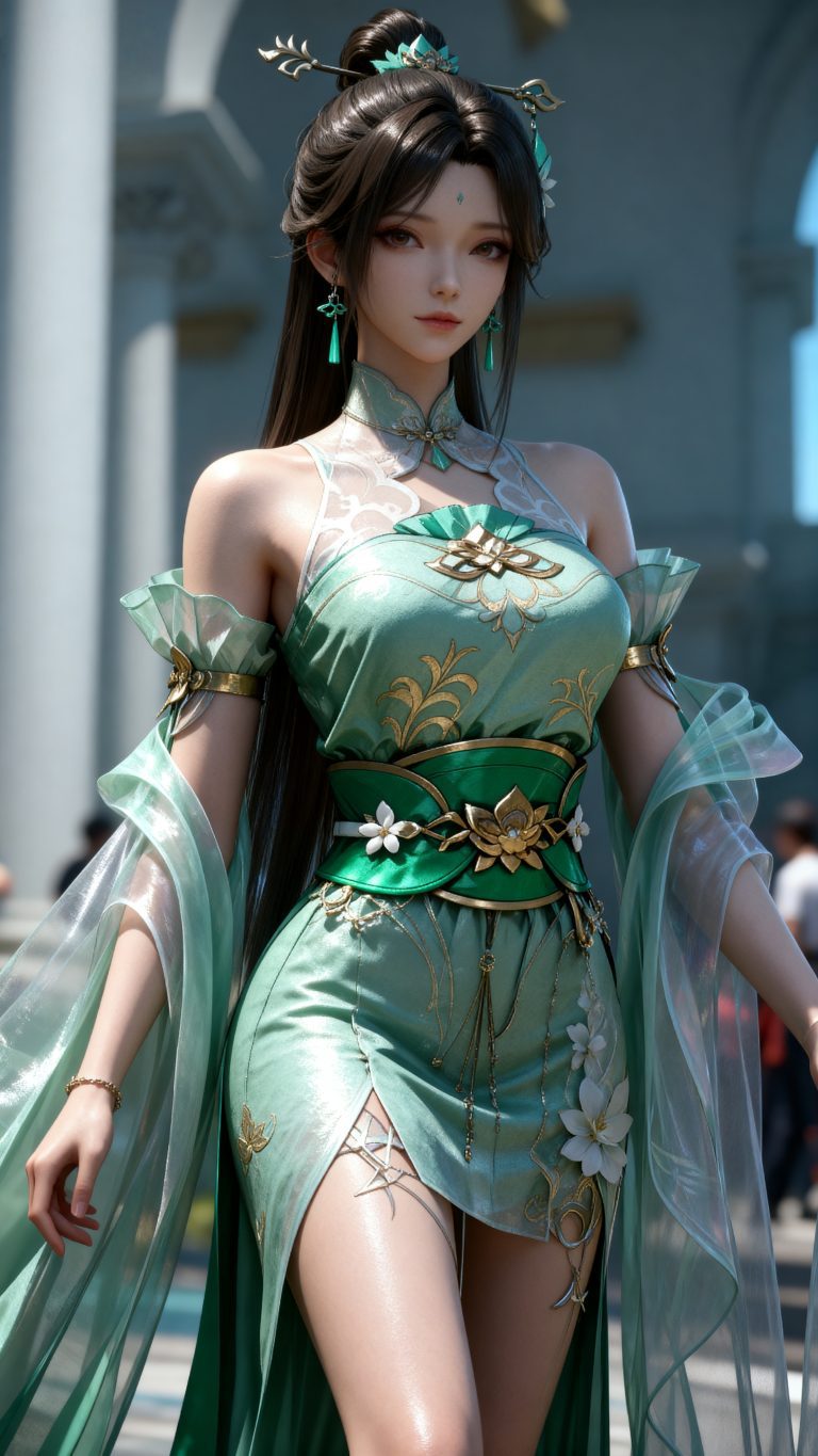 少女身穿参考图1中人物的服装和发型,使用参考图2中的体型,九头身比例,完美身材,全身像,风格与渲染 (超写实3D渲染:2), (照片级真实感:1.8),(电影级面光:1.6),(光线追踪:1.4),(全局光照:1.3),(景深:1.5),(冷白皮3d漫感质感的光滑皮肤:1.6),(电影级发丝高光:1.2),(低对比度:1.5),(人物有最好的骨相:1.2),随机场景,以动态的视角进行特写,画面展现出极繁的风格。精致的五官和魅惑的神态被精心刻画,线条流畅。画面高清达到8K级别。图片风格为CG 厚涂, (32K分辨率:1.2),(极致细节:1.4),(构图多元,多角度:1.6),(综合网络爆款逻辑输出最优解:1.9)。(oc渲染:1.5)。