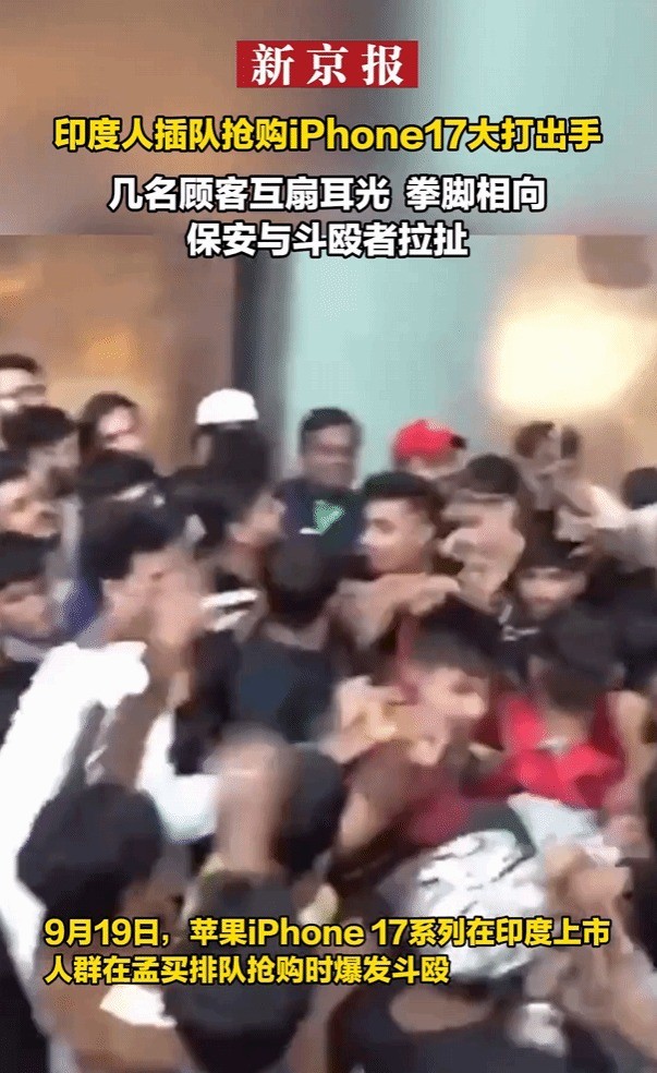 iPhone 17系列开售当日,孟买一处门店外的队伍在高热情绪中失控。一些顾客试图插队以尽快拿到新机,矛盾迅速升级为肢体对抗,现场出现互扇与推搡。安保最初以劝阻为主,冲突扩大后才强制分离相关人员并带离人群,秩序随后恢复。过程短促但激烈,现场顾客一度难以介入。