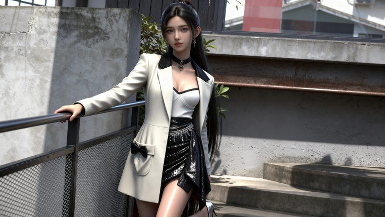 一位少女身穿参考图1中人物的服装、发型和背景,使用参考图2中的体型,九头身比例,完美身材,全身像,风格与渲染 (超写实3D渲染:2), (照片级真实感:1.8),(电影级面光:1.6),(光线追踪:1.4),(全局光照:1.3),(景深:1.5),(冷白皮3d漫感质感的光滑皮肤:1.6),(电影级发丝高光:1.2),(低对比度:1.5),(人物有最好的骨相:1.2),随机场景,以动态的视角进行特写,画面展现出极繁的风格。精致的五官和魅惑的神态被精心刻画,线条流畅。画面高清达到8K级别。图片风格为CG 厚涂, (32K分辨率:1.2),(极致细节:1.4),(构图多元,多角度:1.6),(综合网络爆款逻辑输出最优解:1.9)。(oc渲染:1.5)。空气透视层次,皮肤环境色反射。消失点构图。明亮的画面。3d人物渲染,肌理感,写实逼真,清透的肌肤,清澈单纯的眼神,虚拟引擎背景渲染,巧妙的光影营造出惊艳的效果,眼神灵动有光泽。