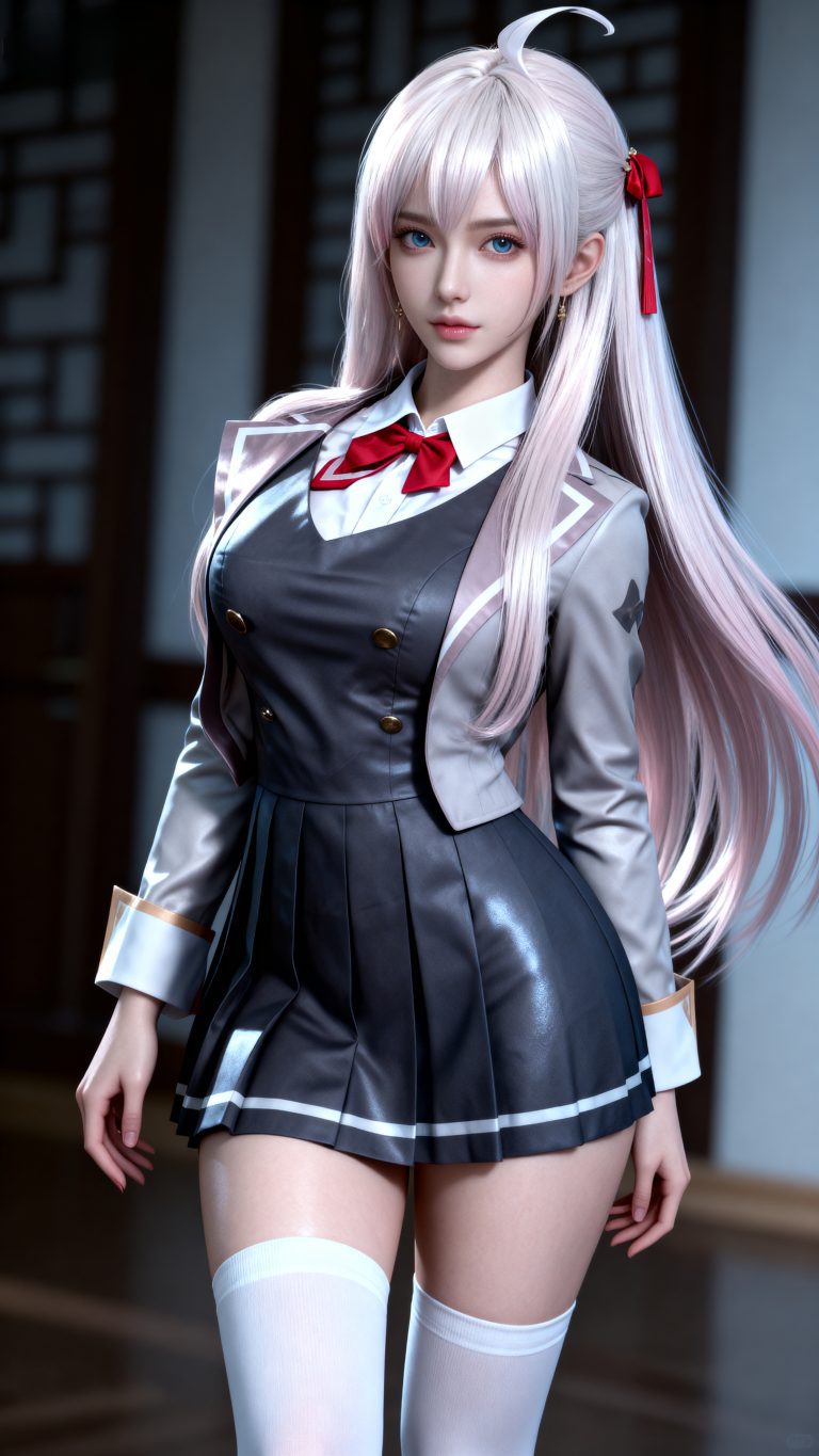 一位少女身穿参考图1中人物的服装、发型,修改成简单背景,使用参考图2中的体型,九头身比例,完美身材,全身像,风格与渲染 (超写实3D渲染:2), (照片级真实感:1.8),(电影级面光:1.6),(光线追踪:1.4),(全局光照:1.3),(景深:1.5),(冷白皮3d漫感质感的光滑皮肤:1.6),(电影级发丝高光:1.2),(低对比度:1.5),(人物有最好的骨相:1.2),随机场景,以动态的视角进行特写,画面展现出极繁的风格。精致的五官和魅惑的神态被精心刻画,线条流畅。画面高清达到8K级别。图片风格为CG 厚涂, (32K分辨率:1.2),(极致细节:1.4),(构图多元,多角度:1.6),(综合网络爆款逻辑输出最优解:1.9)。(oc渲染:1.5)。空气透视层次,皮肤环境色反射。消失点构图。明亮的画面。3d人物渲染,肌理感,写实逼真,清透的肌肤,清澈单纯的眼神,虚拟引擎背景渲染,巧妙的光影营造出惊艳的效果,眼神灵动有光泽。