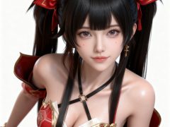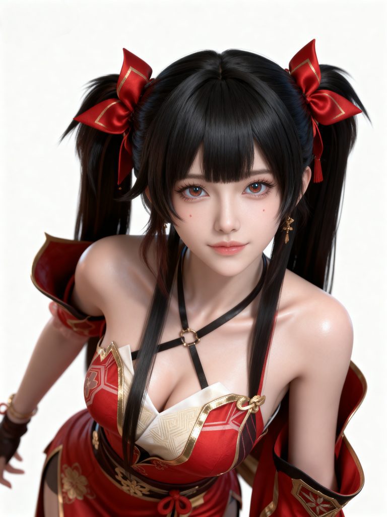 参考图1,指令是保留图1中的黑色双马尾发型、红色蝴蝶结发饰、红色为主的古风服饰及金色花纹装饰,修改为简约纯色背景;参考图2,指令是使用图2中的九头身比例完美身材,全身像,动态视角特写,极繁风格,精致五官,魅惑神态,线条流畅,8K高清,CG厚涂风格,32K分辨率,极致细节,构图多元多角度,消失点构图,明亮画面,3D人物渲染,肌理感,写实逼真,清透肌肤,清澈单纯眼神,虚拟引擎背景渲染,巧妙光影效果,眼神灵动有光泽