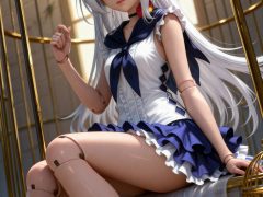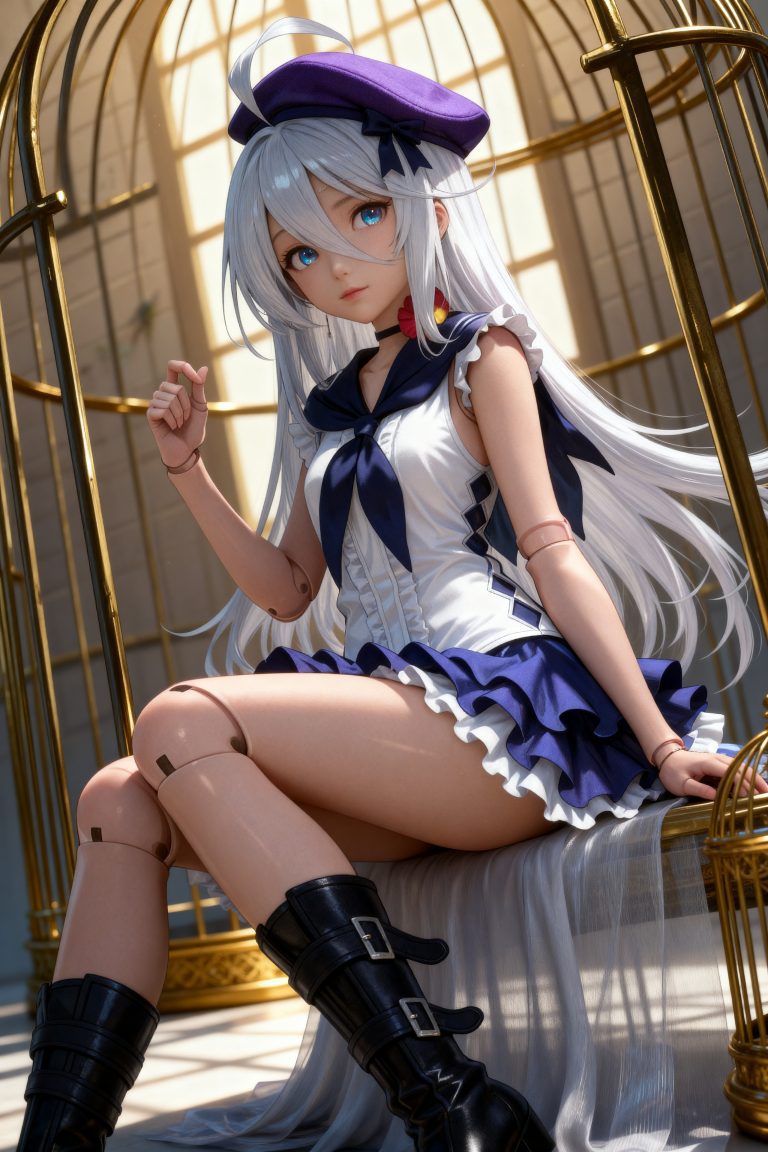 参考图1,指令是保留图1中的银白色长发、紫色海军帽、白色无袖上衣配深蓝色领结、蓝白荷叶边短裙、黑色长筒靴及金色鸟笼背景;参考图2,指令是使用图2中的九头身比例完美身材,全身像,动态视角特写,极繁风格,精致五官,魅惑神态,线条流畅,8K高清,CG厚涂风格,32K分辨率,极致细节,构图多元多角度,消失点构图,明亮画面,3D人物渲染,肌理感,写实逼真,清透肌肤,清澈单纯眼神,虚拟引擎背景渲染,巧妙光影效果,眼神灵动有光泽