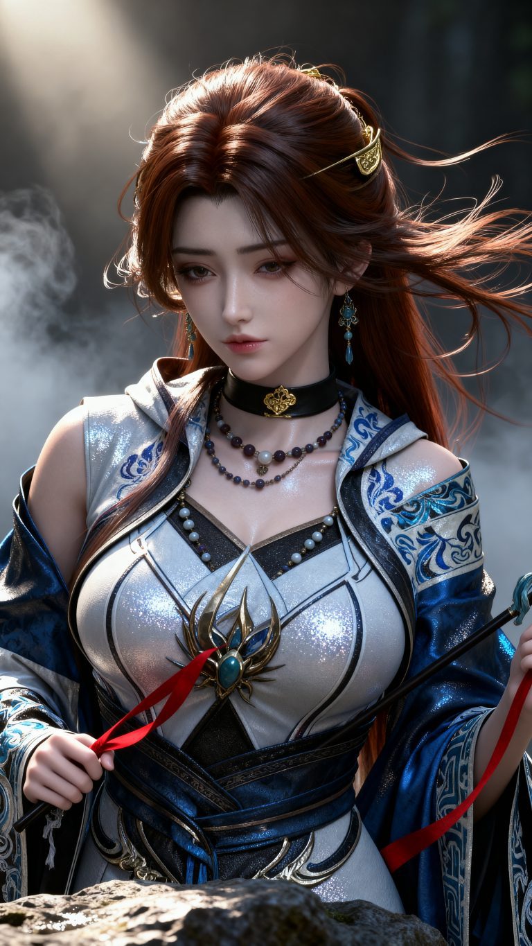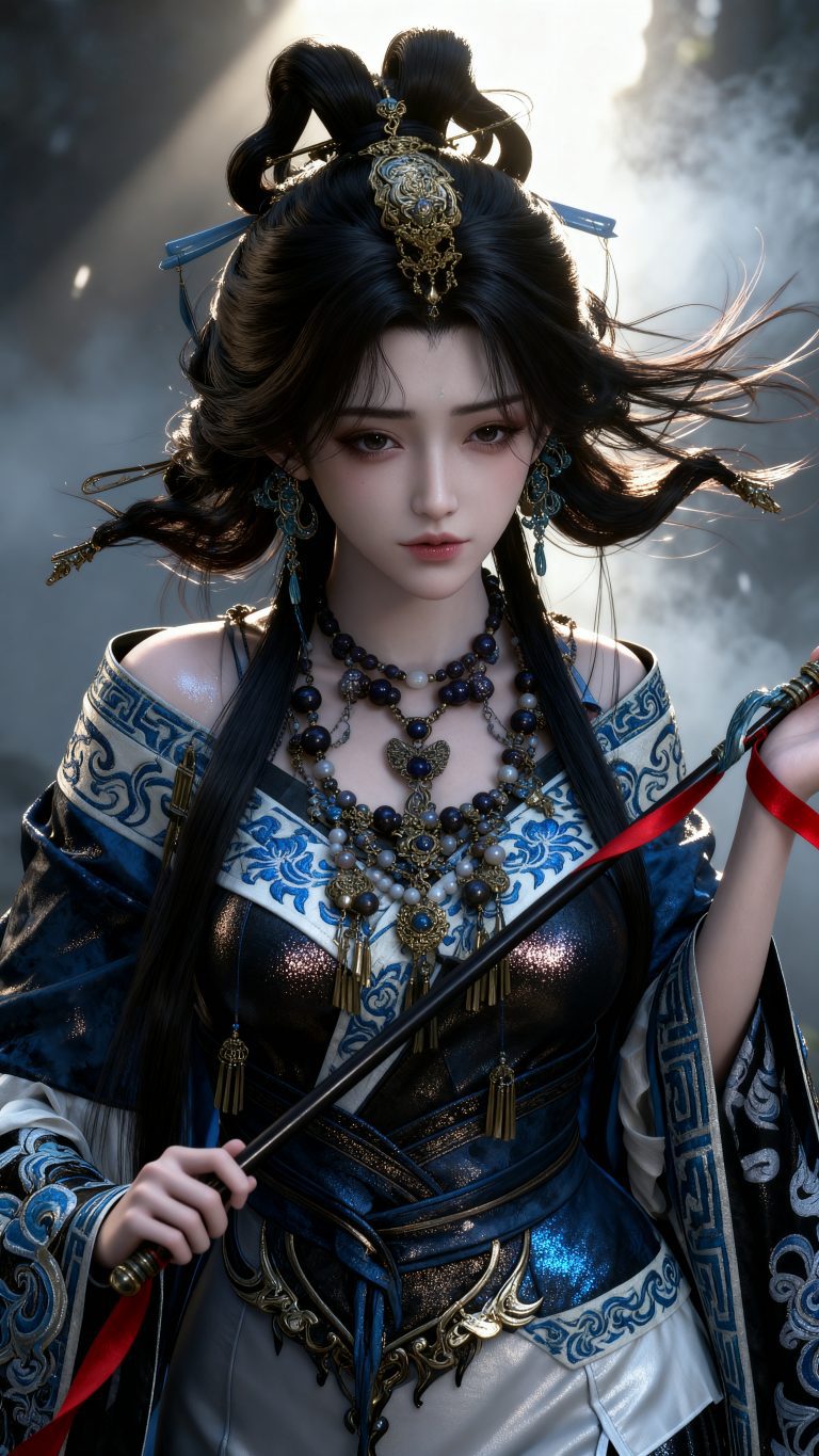一位少女,参考图1的服装、发型、发色和背景,参考图2的体型身材和脸,风吹起长发飘逸,远景和特写结合,长发稍稍凌乱,面容精致立体,皮肤细腻白皙,表情糅合冷酷与忧郁清冷,细微神态楚楚动人,背景烘托电影氛围,面部特写捕捉慵懒动态,写实笔触刻画发丝层次与皮肤通透感,CG厚涂增强光影质感,立体光,魅力十足,无瑕娇嫩肌肤,身材比例均衡,时尚、朝气蓬勃,3D渲染技术,oc渲染,专业摄影光照,大级构建画面,全画幅清晰对焦,使图像达到32K壁纸级质感,闪粉布朗运动,瓷光肌理(SSS次表面3层透光),量子发丝系统(12万根独立动力学)。