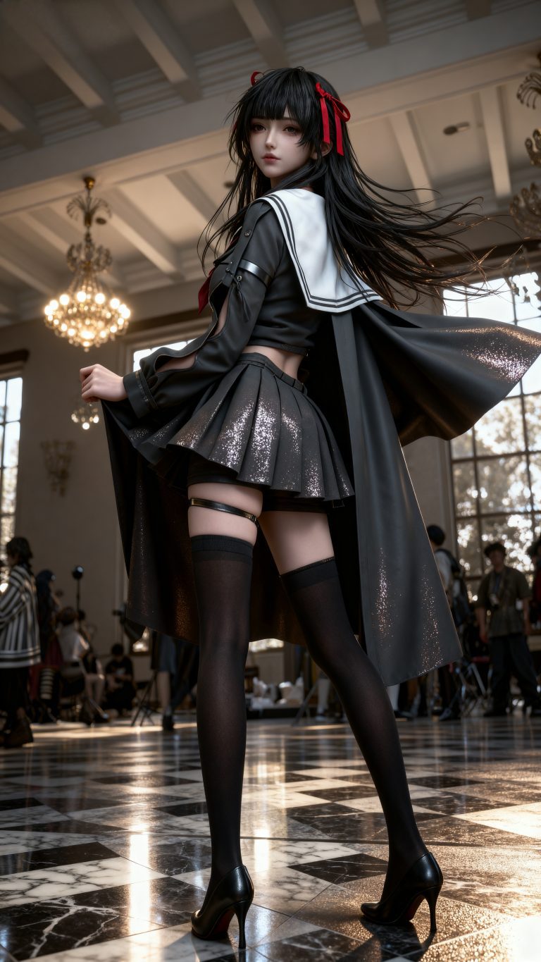 一位少女,参考图2的服装、发型、发色和背景,参考图1的体型身材和脸,风吹起长发飘逸,远景和特写结合,长发稍稍凌乱,面容精致立体,皮肤细腻白皙,表情糅合冷酷与忧郁清冷,细微神态楚楚动人,背景烘托电影氛围,面部特写捕捉慵懒动态,写实笔触刻画发丝层次与皮肤通透感,CG厚涂增强光影质感,立体光,魅力十足,无瑕娇嫩肌肤,身材比例均衡,时尚、朝气蓬勃,3D渲染技术,oc渲染,专业摄影光照,大级构建画面,全画幅清晰对焦,使图像达到32K壁纸级质感,闪粉布朗运动,瓷光肌理(SSS次表面3层透光),量子发丝系统(12万根独立动力学)。