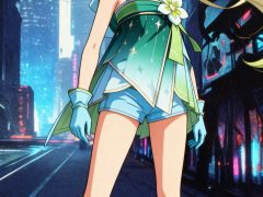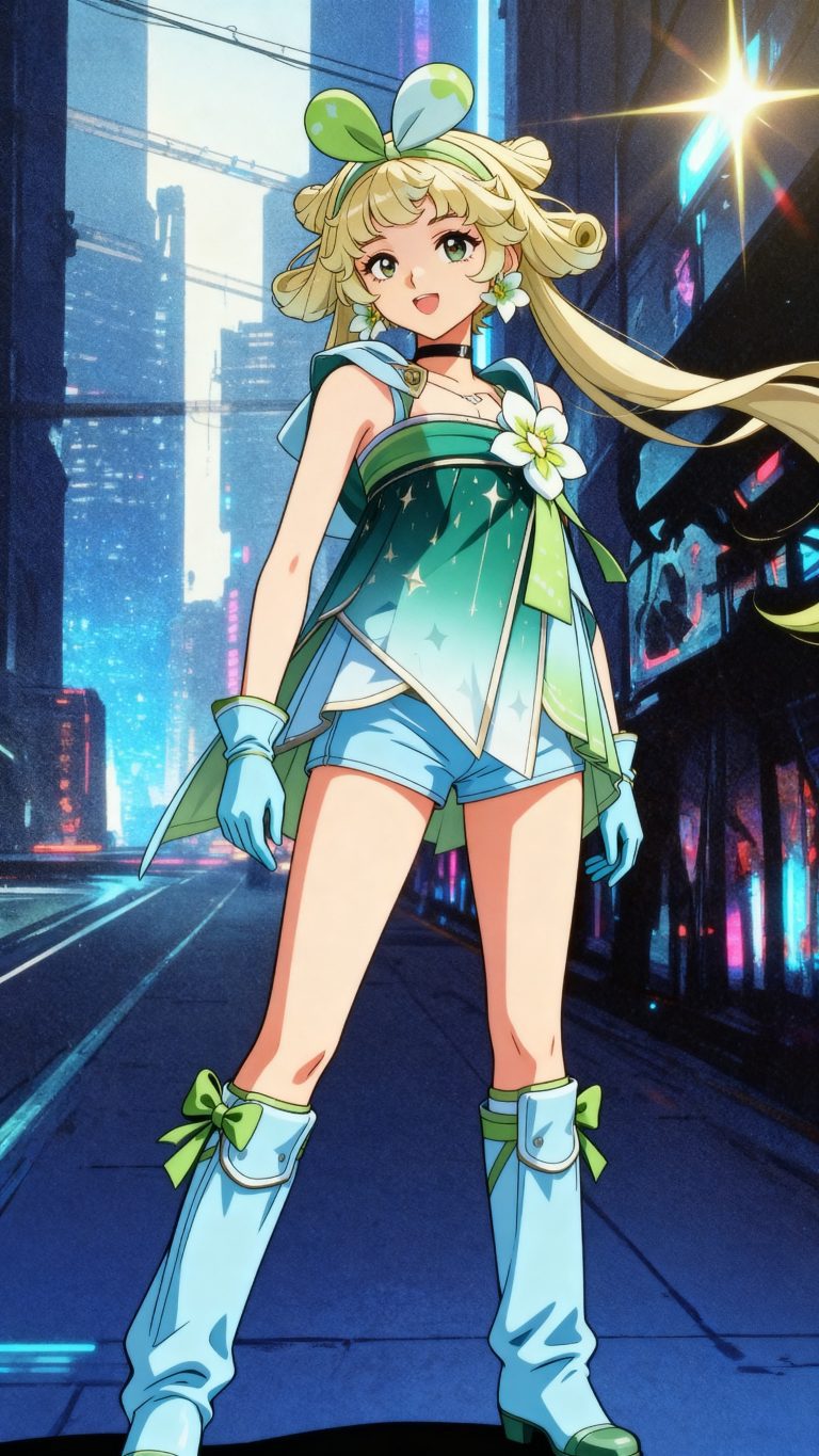 一位少女,严格参考图1的画风和体型,参考图2的服装样式、发型、发色,90年代OVA动画质感,赛璐璐风格渲染,复古胶片颗粒,柔光滤镜,光学衍射。