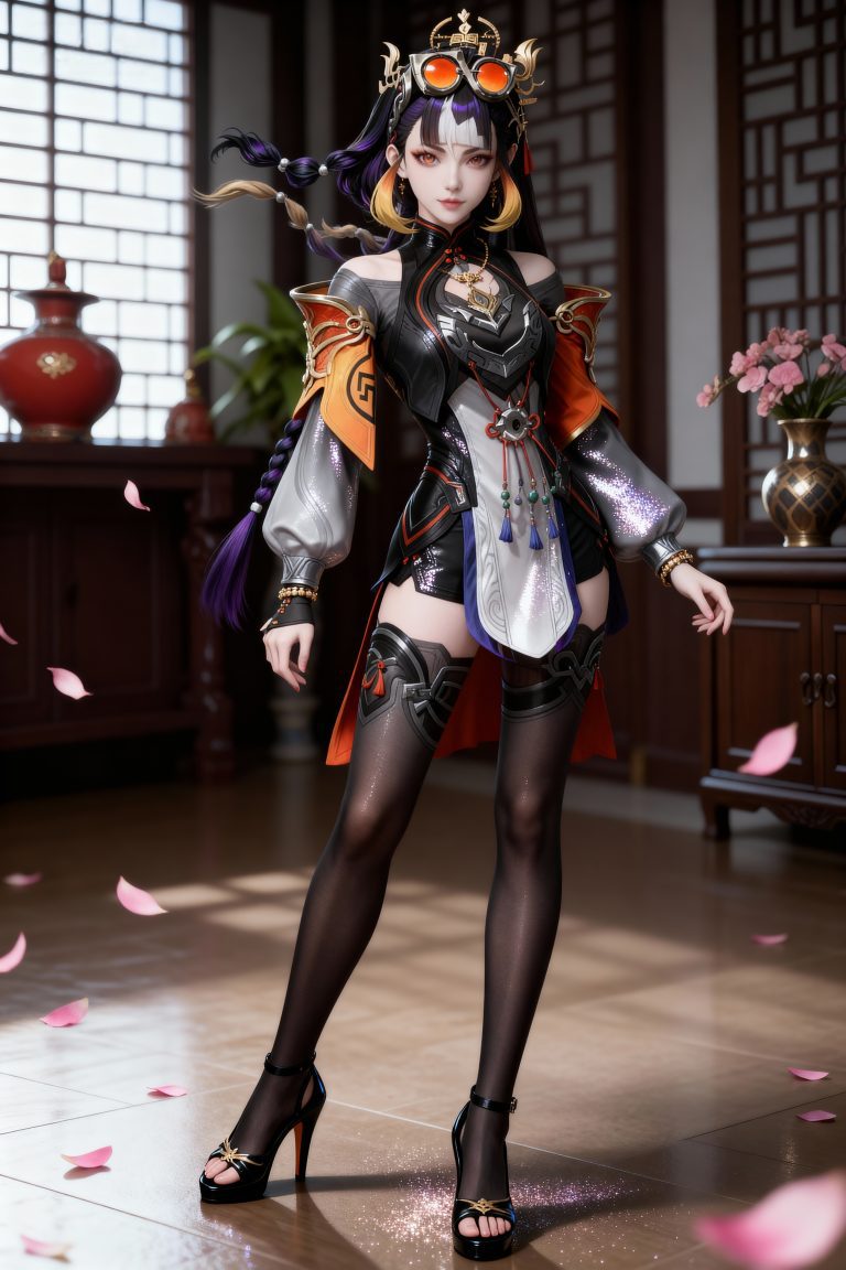一位少女,严格参考图2的服装样式、发型、发色和背景,参考图1的风格,远景和特写结合,面容精致立体,带着妩媚,媚骨天成,皮肤细腻白皙,露出魅惑的表情,细微神态楚楚动人,背景烘托电影氛围,写实笔触刻画发丝层次与皮肤通透感,CG厚涂增强光影质感,立体光,魅力十足,无瑕娇嫩肌肤,成人身材,完美头身比例,九头身,大长腿,时尚、朝气蓬勃,3D渲染技术,oc渲染,专业摄影光照,大级构建画面,全画幅清晰对焦,使图像达到32K壁纸级质感,闪粉布朗运动,瓷光肌理(SSS次表面3层透光),量子发丝系统(12万根独立动力学)。光线追踪。裸眼3D效果。