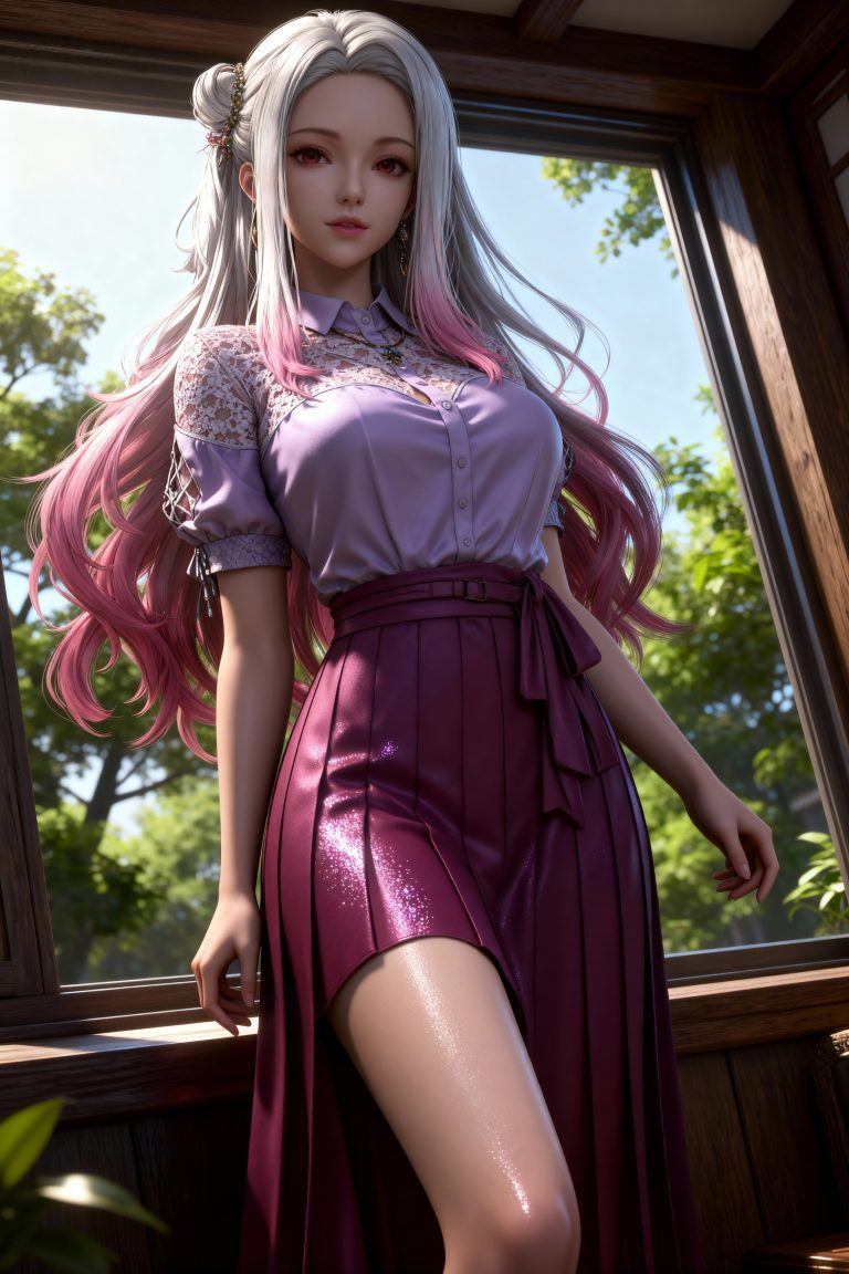 一位少女,严格参考图2的服装样式、发型、发色和背景,参考图1的风格,远景和特写结合,面容精致立体,带着妩媚,媚骨天成,皮肤细腻白皙,露出魅惑的表情,细微神态楚楚动人,背景烘托电影氛围,写实笔触刻画发丝层次与皮肤通透感,CG厚涂增强光影质感,立体光,魅力十足,无瑕娇嫩肌肤,成人身材,完美头身比例,九头身,大长腿,时尚、朝气蓬勃,3D渲染技术,oc渲染,专业摄影光照,大级构建画面,全画幅清晰对焦,使图像达到32K壁纸级质感,闪粉布朗运动,瓷光肌理(SSS次表面3层透光),量子发丝系统(12万根独立动力学)。光线追踪。裸眼3D效果。