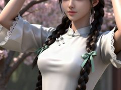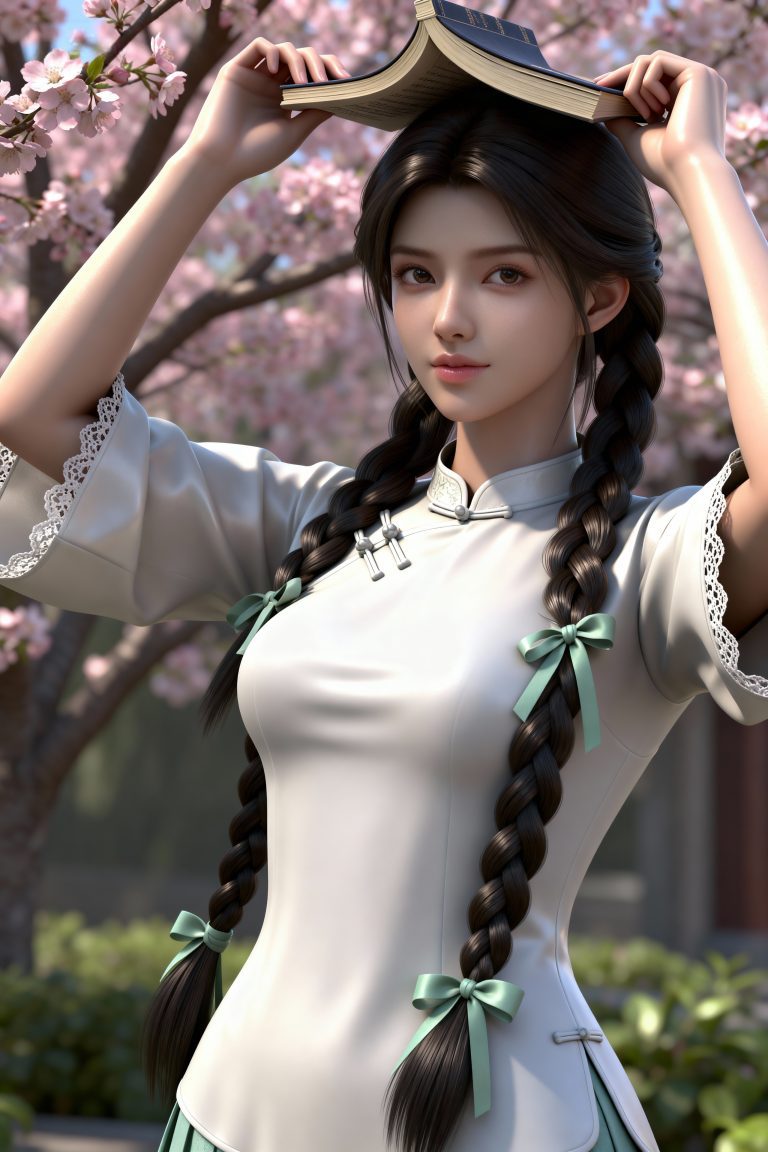一位少女,严格参考图2的服装样式、发型、发色和背景,参考图1的风格,远景和特写结合,面容精致立体,带着妩媚,媚骨天成,皮肤细腻白皙,露出魅惑的表情,细微神态楚楚动人,背景烘托电影氛围,写实笔触刻画发丝层次与皮肤通透感,CG厚涂增强光影质感,立体光,魅力十足,无瑕娇嫩肌肤,成人身材,完美头身比例,九头身,大长腿,时尚、朝气蓬勃,3D渲染技术,oc渲染,专业摄影光照,大级构建画面,全画幅清晰对焦,使图像达到32K壁纸级质感,闪粉布朗运动,瓷光肌理(SSS次表面3层透光),量子发丝系统(12万根独立动力学)。光线追踪。裸眼3D效果。
