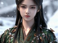 一位少女,严格参考图2的服装样式、发型、发色和背景,参考图1的风格,远景和特写结合,面容精致立体,带着妩媚,媚骨天成,皮肤细腻白皙,露出魅惑的表情,细微神态楚楚动人,背景烘托电影氛围,写实笔触刻画发丝层次与皮肤通透感,CG厚涂增强光影质感,立体光,魅力十足,无瑕娇嫩肌肤,成人身材,完美头身比例,九头身,大长腿,时尚、朝气蓬勃,3D渲染技术,oc渲染,专业摄影光照,大级构建画面,全画幅清晰对焦,使图像达到32K壁纸级质感,闪粉布朗运动,瓷光肌理(SSS次表面3层透光),量子发丝系统(12万根独立动力学)。光线追踪。裸眼3D效果。