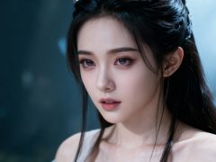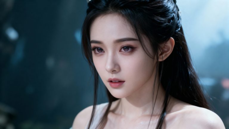 一位少女,中国修仙电视剧风格,面容精致立体,真人演出,写实真人,带着妩媚,媚骨天成,皮肤细腻白皙,露出魅惑的表情,细微神态楚楚动人,背景烘托电视剧氛围,写实笔触刻画发丝层次与皮肤通透感。
