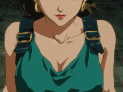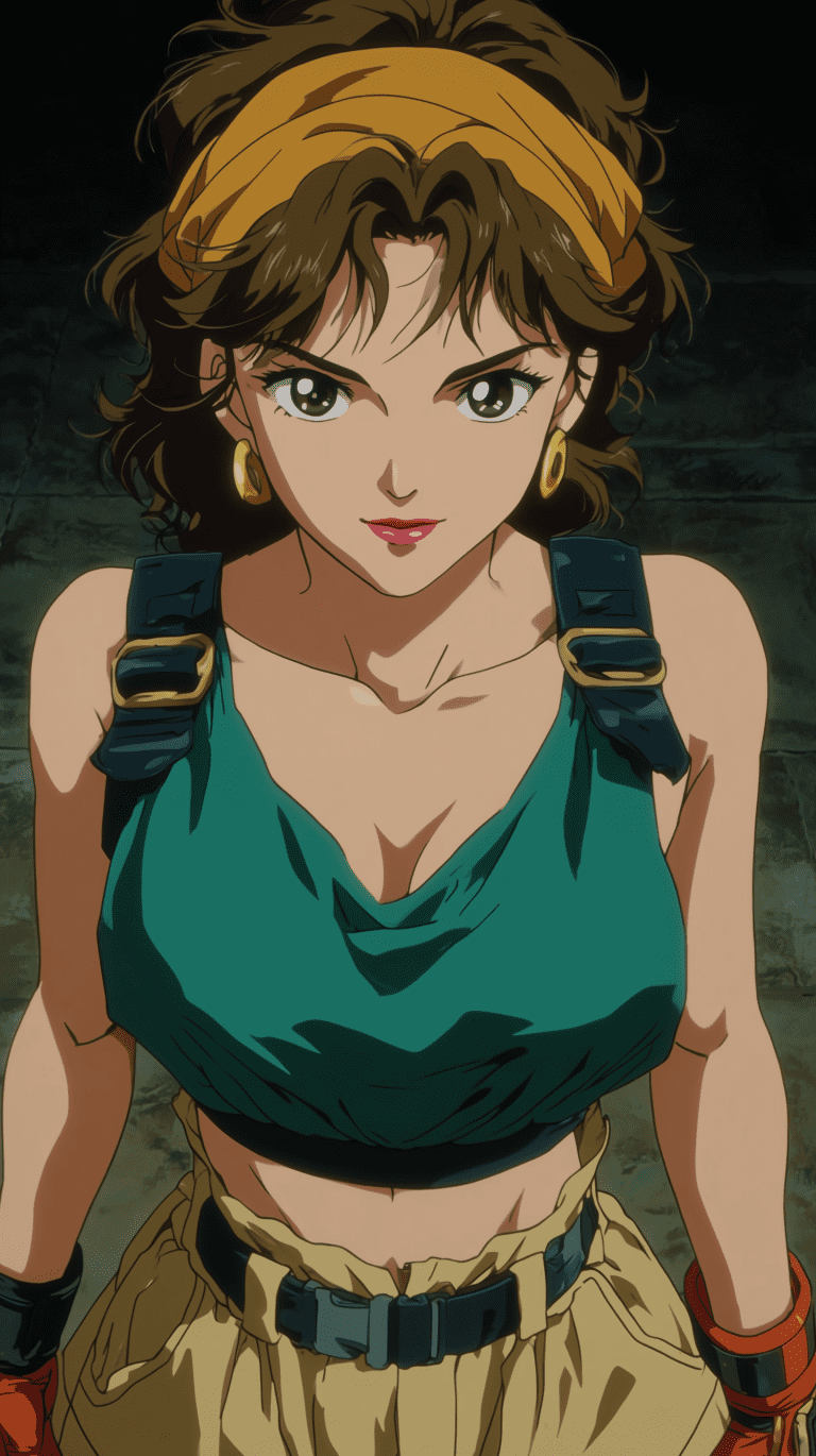 female anime warrior, 80s 90s retro OVA anime style, muscular slim body, short brown hair with headband, green sleeveless crop top, black leather straps and belts, armored shoulder pad, orange and black gloves, beige shorts with belt, confident smile, fighting pose, highly detailed, sharp cel shading, bold outlines, vibrant saturated colors, retro anime eyes, cinematic lighting, VHS film grain, 1980s 1990s Japanese OVA illustration style, old anime magazine poster aesthetic, dynamic composition, anime keyframe art, –ar 9:16 –sref 279610627 –sv 4 –sw 500 –stylize 1000