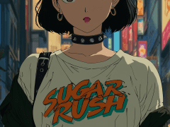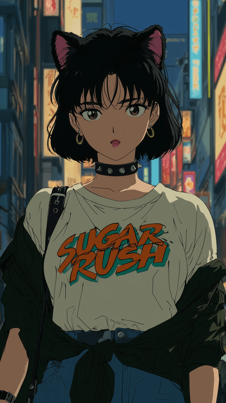 Classic 90s Japanese anime style illustrations,anime catgirl, modern street punk fashion, short black bob hair with pink highlights, fluffy black cat ears with purple inner fur, choker collar with metal studs, black wristband, oversized white t-shirt with colorful cartoon cat logo “SUGAR RUSH”, tied jacket around waist, confident yet mysterious expression, standing in neon-lit city street background retro anime aesthetics, sharp cel shading, bold thick outlines, saturated vibrant colors, dramatic contrast lighting, VHS film grain, glowing neon lights, cyberpunk atmosphere, anime magazine poster style, inspired by Bubblegum Crisis, Cyber City Oedo 808, City Hunter, retro Tokyo street vibe, cinematic keyframe art, 1980s 1990s OVA style illustration, –ar 9:16 –sref 279610627 –sv 4 –sw 500 –stylize 1000