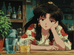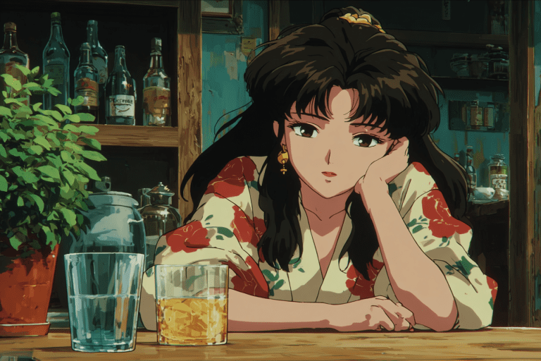 Classic 90s Japanese anime style illustrations,anime girl in traditional modern fusion outfit, sitting at a wooden table in a Japanese cafe, wearing elegant cream-colored kimono-style blouse with floral patterns and puffed sleeves, long straight brown hair with bangs and a hairpin, wearing a soft beige face mask, holding a glass of water, gentle and calm atmosphere, looking down thoughtfully 80s 90s Japanese OVA anime style, retro slice-of-life mood, warm soft lighting, cel shading with bold outlines, pastel yet saturated colors, VHS film grain texture, cinematic anime composition, inspired by Maison Ikkoku, Whisper of the Heart, retro shoujo anime illustration –ar 3:2 –sref 279610627 –sv 4 –sw 500 –stylize 1000