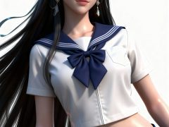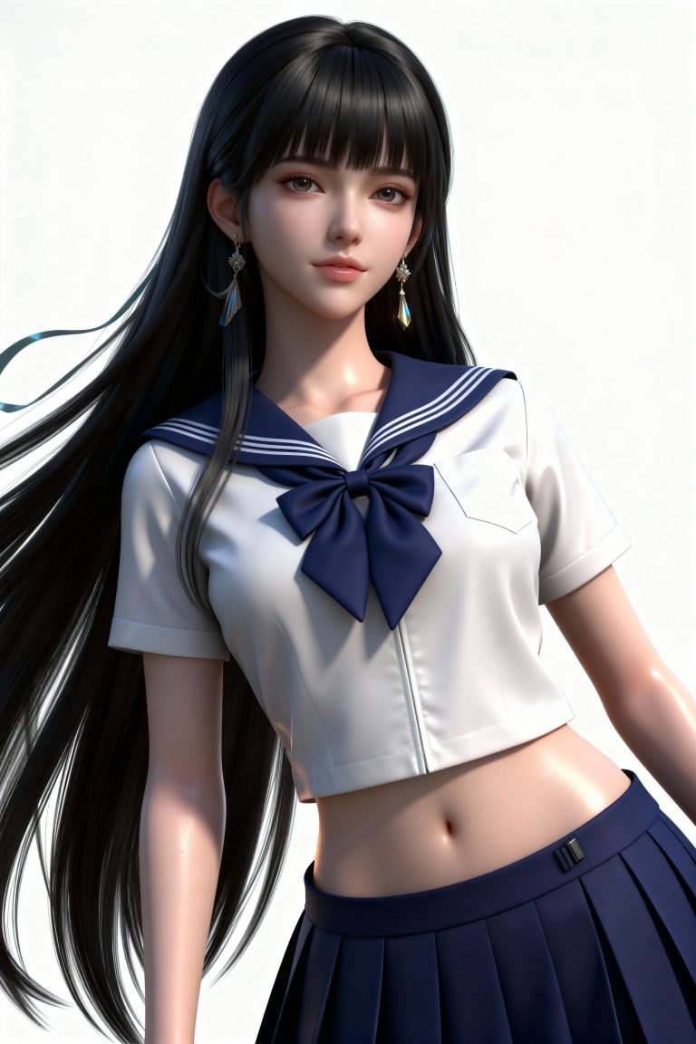 一位少女,严格参考图2的服装样式、发型、发色和背景,参考图1的风格,远景和特写结合,面容精致立体,带着妩媚,媚骨天成,皮肤细腻白皙,露出魅惑的表情,细微神态楚楚动人,背景烘托电影氛围,写实笔触刻画发丝层次与皮肤通透感,CG厚涂增强光影质感,立体光,真实光照,魅力十足,无瑕娇嫩肌肤,成人身材,完美头身比例,九头身,大长腿,时尚、朝气蓬勃,3D渲染技术,oc渲染,专业摄影光照,大级构建画面,全画幅清晰对焦,使图像达到32K壁纸级质感,瓷光肌理(SSS次表面3层透光),量子发丝系统(12万根独立动力学)。光线追踪。裸眼3D效果。迎面光照。美白滤镜。高对比度,赛璐璐风格,白色背景