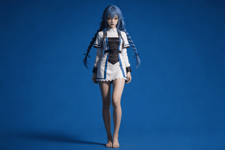 人物形象参考图2,写实风格,写真风格,真人皮肤,真人3d建模脸,超高分辨率,全身女,冷酷漠视,广角景深,高亮度,ue5渲染,强对比,电影级特效,高挑修长,日系风格,纯色蓝色背景。