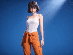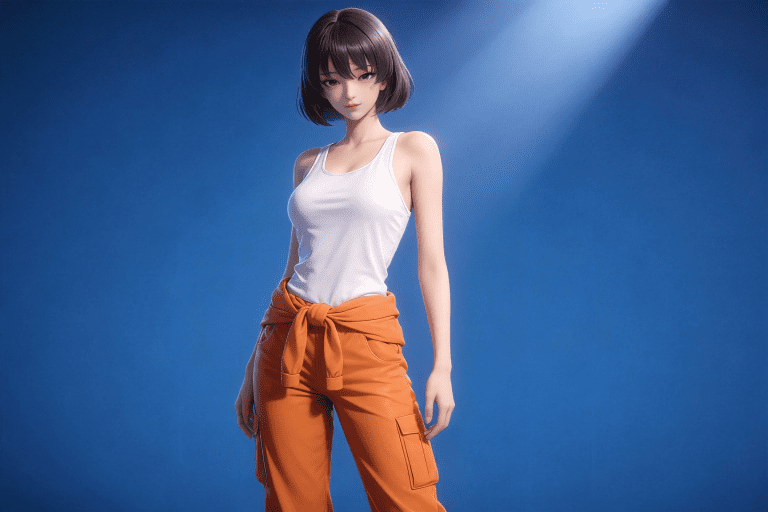 人物形象参考图2,写实风格,写真风格,建模3d皮肤,白嫩皮肤,美白滤镜,真人3d建模脸,超高分辨率,全身女,冷酷漠视,广角景深,高亮度,立体光,ue5建模,强对比,电影级特效,高挑修长,日系风格,纯色蓝色背景。3d动画渲染,壁纸。散射光,景深。