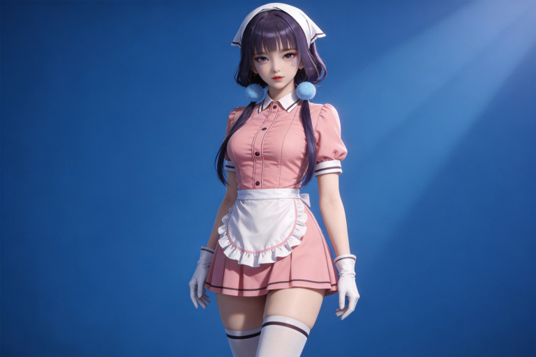 人物形象参考图2,写实风格,写真风格,建模3d皮肤,白嫩皮肤,美白滤镜,真人3d建模脸,超高分辨率,全身女,冷酷漠视,广角景深,高亮度,立体光,ue5建模,强对比,电影级特效,高挑修长,日系风格,纯色蓝色背景。3d动画渲染,壁纸。散射光,景深。