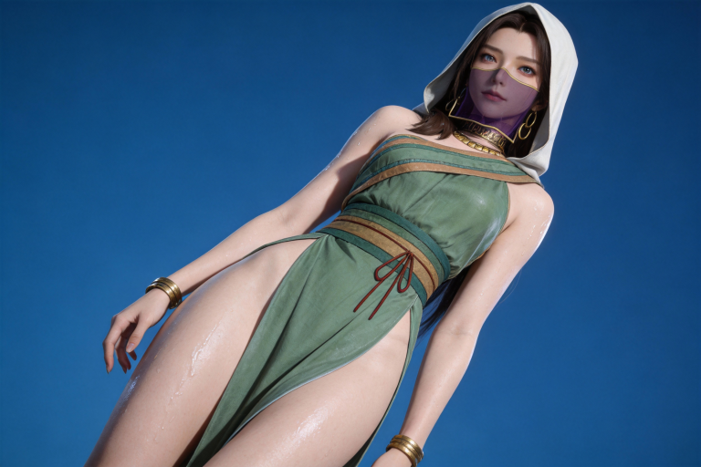 人物形象参考图2,写实风格,写真风格,建模3d皮肤,全身皮肤湿润,精细的皮肤纹理,精细的衣服纹理,白嫩皮肤,美白滤镜,真人3d建模脸,超高分辨率,全身女,冷酷漠视,广角景深,高亮度,立体光,ue5建模,强对比,电影级特效,高挑修长,日系风格,纯色蓝色背景。3d动画渲染,壁纸。散射光,景深。