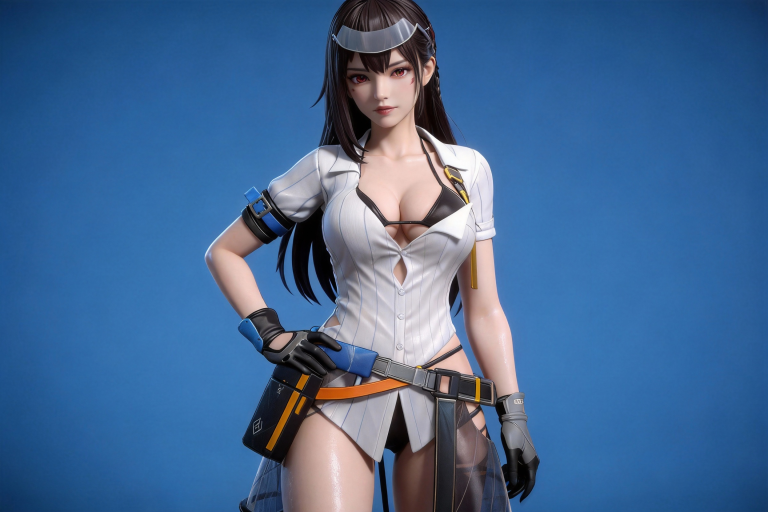 人物形象参考图2,写实风格,写真风格,东方韵味,神性美感,建模3d皮肤,次表面散射,全身皮肤湿润,精细的皮肤纹理,精细的衣服纹理,白嫩皮肤,美白滤镜,真人3d建模脸,超高分辨率,全身女,冷酷漠视,广角景深,高亮度,立体光,ue5建模,强对比,电影级特效,高挑修长,日系风格,纯色蓝色背景。3d动画渲染,壁纸。散射光,景深。