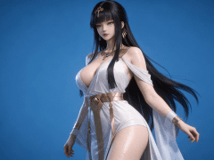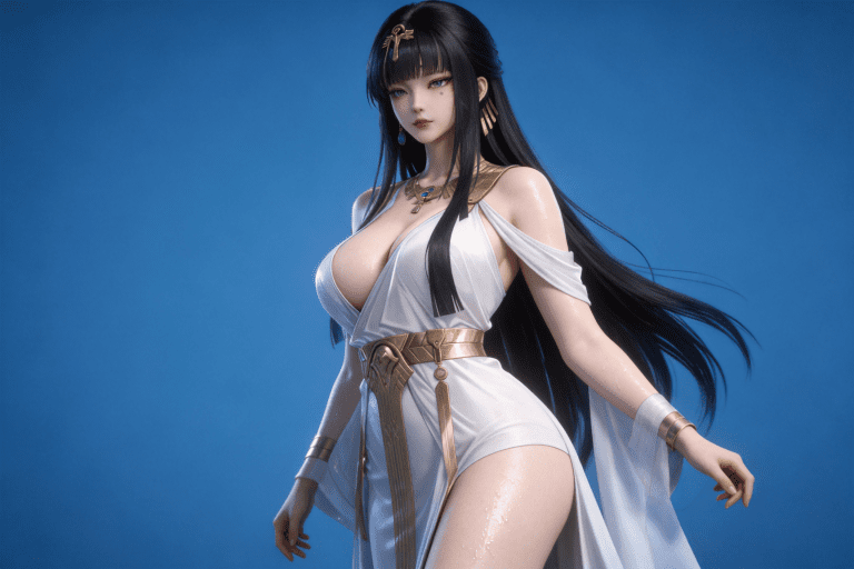 人物形象参考图2,写实风格,写真风格,东方韵味,神性美感,建模3d皮肤,次表面散射,全身皮肤湿润,精细的皮肤纹理,精细的衣服纹理,白嫩皮肤,美白滤镜,真人3d建模脸,超高分辨率,全身女,高亮度,立体光,ue5建模,强对比,电影级特效,高挑修长,日系风格,纯色蓝色背景。3d动画渲染,景深。