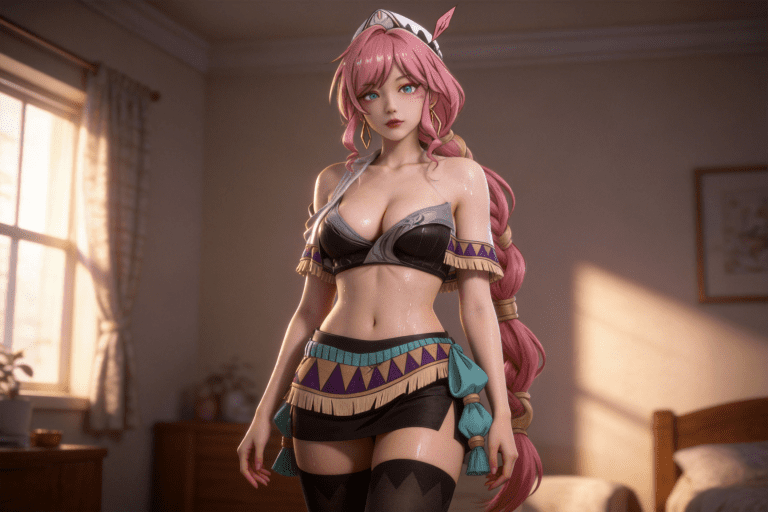 人物形象参考图2,写实风格,写真风格,东方韵味,神性美感,建模3d皮肤,次表面散射,全身皮肤湿润,精细的皮肤纹理,精细的衣服纹理,白嫩皮肤,美白滤镜,真人3d建模脸,超高分辨率,全身女,高亮度,立体光,ue5建模,强对比,电影级特效,高挑修长,日系风格,温馨的房间背景。3d动画渲染,景深。