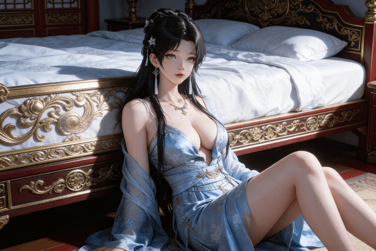 人物形象参考图2,写实风格,写真风格,东方韵味,神性美感,建模3d皮肤,次表面散射,全身皮肤湿润,精细的皮肤纹理,精细的衣服纹理,白嫩皮肤,美白滤镜,真人3d建模脸,超高分辨率,全身女,高亮度,立体光,ue5建模,强对比,电影级特效,高挑修长,日式风格,3d动画渲染,景深。“人物平躺在豪华古代床上搔首弄姿”,刚睡醒的姿势,衣服稍微有点凌乱。镜头对着床头拍。