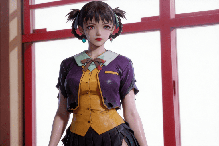 人物形象参考图2,写实风格,写真风格,东方韵味,神性美感,建模3d皮肤,次表面散射,全身皮肤湿润,精细的皮肤纹理,精细的衣服纹理,白嫩皮肤,美白滤镜,真人3d建模脸,超高分辨率,全身女,高亮度,立体光,ue5建模,强对比,电影级特效,高挑修长,日式风格,凡人修仙传动画风格,3d动画渲染,景深。参考图2背景,衣服稍微有点凌乱。