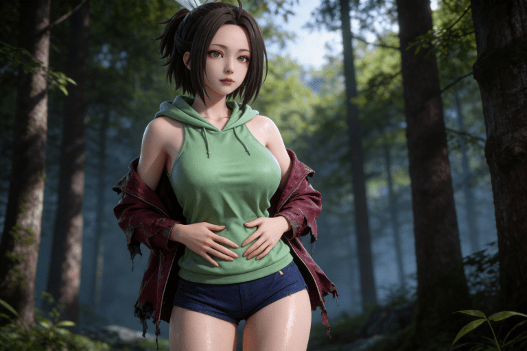 人物形象参考图2,写实风格,写真风格,东方韵味,神性美感,建模3d皮肤,次表面散射,全身皮肤湿润,精细的皮肤纹理,精细的衣服纹理,白嫩皮肤,美白滤镜,真人3d建模脸,超高分辨率,全身女,高亮度,立体光,ue5建模,强对比,电影级特效,高挑修长,日式风格,凡人修仙传动画风格,3d动画渲染,景深。参考图2背景,衣服稍微有点凌乱。bjd人偶感。