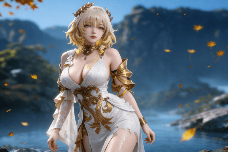 人物形象参考图2,写实风格,写真风格,东方韵味,神性美感,建模3d皮肤,次表面散射,全身皮肤湿润,精细的皮肤纹理,精细的衣服纹理,白嫩皮肤,美白滤镜,真人3d建模脸,超高分辨率,全身女,高亮度,立体光,ue5建模,强对比,电影级特效,高挑修长,日式风格,凡人修仙传动画风格,3d动画渲染,景深。参考图2背景,衣服稍微有点凌乱。bjd人偶感。