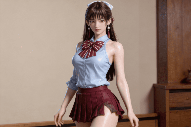 人物形象参考图2,写实风格,写真风格,东方韵味,神性美感,建模3d皮肤,次表面散射,全身皮肤湿润,精细的皮肤纹理,精细的衣服纹理,白嫩皮肤,美白滤镜,真人3d建模脸,超高分辨率,全身女,高亮度,立体光,ue5建模,强对比,电影级特效,高挑修长,日式风格,凡人修仙传动画风格,3d动画渲染,景深。参考图2背景,衣服稍微有点凌乱。bjd人偶感。
