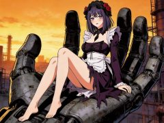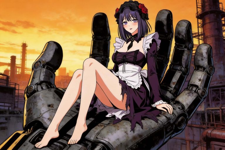 根据参考图人物,生成一张融合了井上雄彦画风与80年代赛璐璐动画的全身图。角色身材高挑修长,衣服略显凌乱。她坐在一个巨大的、废弃的机器人手掌上,背景是黄昏时分的工业城市。画面光影对比强烈,线条粗犷有力,充满故事感和怀旧画风。