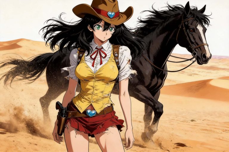 参考图中人物形象,将其重塑为融合了井上雄彦画风与80年代赛璐璐动画的风格。全身女性角色,身材高挑修长,保留其西部女牛仔的气质。她身穿一套在雨中变得凌乱的服装,站在一个泥泞的小镇街道中央,准备拔枪对决,雨水顺着帽檐滴落。画面采用强烈的明暗对比和粗粝的手绘线条,营造出电影般的戏剧张力和怀旧质感。