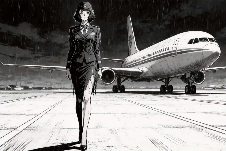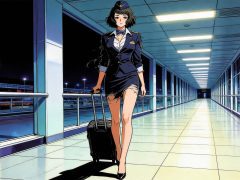 参考图中角色,创作一张融合了井上雄彦画风与80年代赛璐璐动画的全身图。角色高挑修长,空乘制服因长途飞行而略显凌乱。她拖着行李箱,独自走在深夜空无一人的候机大厅里,背景是长长的走廊和明亮的灯光。画面采用高对比度的光影和充满张力的手绘线条,色彩饱和度高,展现出一种孤独而又充满力量的美感。