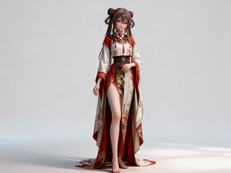 参考图中角色,重塑为全身站立形象。采用超写实3D动画风格,类似高质量游戏CG。角色身材高挑修长,表情魅惑,具有东方韵味和神性美感。皮肤呈现UE5建模的3D质感,有次表面散射效果,肤色白嫩细腻。服装纹理精细,姿态优雅。背景为简约的纯色背景,光影柔和,电影级渲染,高细节。