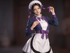 做出魅惑的动作,写实风格,写真风格,东方韵味,神性美感,建模3d皮肤,次表面散射,皮肤光泽感强,水润通透,精细的皮肤纹理,精细的衣服纹理,白嫩皮肤,美白滤镜,真人3d建模脸,超高分辨率,全身女,ue5建模,高细节,电影级特效,高挑修长,3d动画渲染,景深。高饱和,反射,折射,肌理质感。大片高级感,电影美学,大师杰作。CGI,虚幻引擎5渲染,oc渲染。深蓝色长袖女仆制服外套,领口为紫色翻领,搭配白色荷叶边立领,领结中央有一枚金色圆形纽扣;内搭白色衬衫,衣襟有竖条纹纹理;胸前系有紫色腰带,打成蝴蝶结;下身穿着白色围裙,围裙宽大,前幅有自然褶皱和垂坠感,边缘为黑色包边;头戴白色蕾丝花边女仆帽,帽子两侧有紫色缎带装饰;整体为经典日式女仆装风格,布料质感细腻,有轻微光泽,体现丝绸或棉质材质;服装剪裁合身,突出优雅气质。高细节,清晰线条,色彩柔和。
