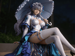 写实风格,写真风格,东方韵味,神性美感,建模3d皮肤,次表面散射,皮肤光泽感强,水润通透,精细的皮肤纹理,精细的衣服纹理,白嫩皮肤,美白滤镜,真人3d建模脸,超高分辨率,全身女,ue5建模,高细节,电影级特效,高挑修长,3d动画渲染,景深。高饱和,反射,折射,肌理质感。大片高级感,电影美学,大师杰作。CGI,虚幻引擎5渲染,oc渲染。人物服装参考图所示。白色紧身胸衣,表面有光泽感,胸前有立体褶皱与蓝色宝石装饰,领口为高领设计,边缘有蓝色蕾丝花边;外搭深蓝色长裙,裙摆宽大,层次丰富,布料为缎面材质,带有星光闪烁效果,裙身绣有金色火焰纹样与蓝色流线图案;肩部有白色披肩,披肩边缘有蓝色荷叶边装饰,袖口为短袖设计,袖口处有蓝色蝴蝶结点缀;腰间系有金色细带,搭配蓝色吊坠;大腿处佩戴白色过膝长筒袜,袜口有银色金属扣环和蓝色丝带装饰;脚穿黑色高跟鞋,鞋面简洁;手持一把浅蓝色蕾丝边阳伞,伞柄为白色,顶端有金色装饰。整体为奇幻风格贵族女性礼服,融合洛丽塔与魔法元素,色彩以蓝、白、金为主,视觉优雅且富有神秘感。高细节,清晰线条,光影柔和。