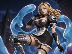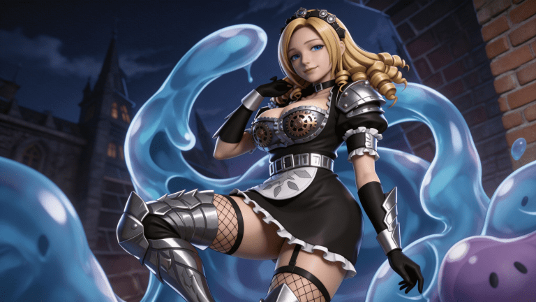 写实风格,写真风格,东方韵味,神性美感,建模3d皮肤,次表面散射,皮肤光泽感强,水润通透,精细的皮肤纹理,精细的衣服纹理,白嫩皮肤,美白滤镜,真人3d建模脸,超高分辨率,全身女,ue5建模,高细节,电影级特效,高挑修长,3d动画渲染,景深。高饱和,反射,折射,肌理质感。大片高级感,电影美学,大师杰作。CGI,虚幻引擎5渲染,oc渲染。人物服装参考图所示。黑色紧身女仆连衣裙,裙摆为短款,边缘有白色蕾丝花边装饰;上身为深V领口设计,胸部外露部分由金属护甲包裹,护甲呈银灰色,表面有齿轮状纹路与铆钉装饰;肩部佩戴大型银色护肩,护肩造型锋利,带有机械感;腰部系有宽大银色腰带,腰带中央有方形金属扣环;大腿处佩戴黑色渔网袜,袜口有黑色绑带固定;腿部装备银色金属护腿,护腿覆盖膝盖至脚踝,表面有几何切割纹理与尖刺设计;手臂佩戴黑色长手套,手套延伸至小臂,手背处有银色护甲片;头戴黑色发箍,发箍上有金属装饰;整体为奇幻风格女仆战斗服,融合哥特、机械与魔法元素,色彩以黑、银、白为主,视觉冲击力强。高细节,清晰线条,光影自然。