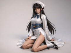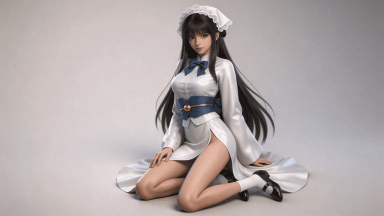 cosplay参考图中的人物,摆出帅气姿势,写实风格,写真风格,东方韵味,神性美感,建模3d皮肤,次表面散射,皮肤光泽感强,水润通透,精细的皮肤纹理,精细的衣服纹理,白嫩皮肤,美白滤镜,真人3d建模脸,超高分辨率,全身女,ue5建模,高细节,电影级特效,高挑修长,3d动画渲染,景深。高饱和,反射,折射,肌理质感。大片高级感,电影美学,大师杰作。CGI,虚幻引擎5渲染,oc渲染。白色长袖女仆连衣裙,材质为光滑缎面,表面有光泽感;领口为立领设计,领结为深蓝色蝴蝶结,系于胸前;腰部系有宽大深蓝色腰带,腰带中央打成蝴蝶结,并用金色圆形扣环固定;裙摆较长,前短后长,前摆开衩至大腿根部,露出腿部线条;袖口为宽松设计,袖子自然垂落;头戴白色蕾丝花边女仆帽,帽子呈三角形,贴合发髻;脚穿黑色皮鞋,鞋面简洁,搭配白色中筒袜,袜口整齐。整体为经典日式女仆装风格,融合古典与性感元素,色彩以白、蓝、金为主,视觉优雅且富有层次感。高细节,清晰线条,光影柔和。