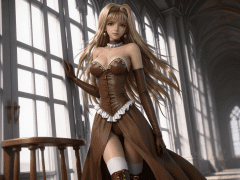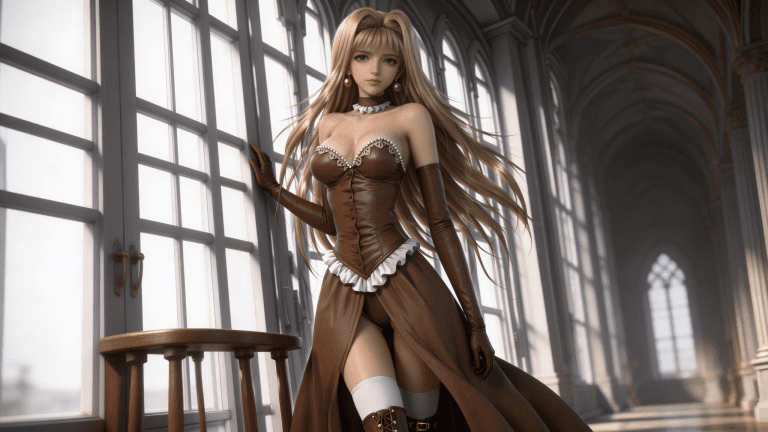 cosplay参考图中的人物,摆出帅气姿势,写实风格,写真风格,东方韵味,神性美感,建模3d皮肤,次表面散射,皮肤光泽感强,水润通透,精细的皮肤纹理,精细的衣服纹理,白嫩皮肤,美白滤镜,真人3d建模脸,超高分辨率,全身女,ue5建模,高细节,电影级特效,高挑修长,3d动画渲染,景深。高饱和,反射,折射,肌理质感。大片高级感,电影美学,大师杰作。CGI,虚幻引擎5渲染,oc渲染。棕色紧身束腰上衣,采用皮革质感材质,表面有光泽感;胸前为深V领口设计,边缘装饰有白色珍珠串与蕾丝花边;前襟有多个棕色纽扣,从胸部延伸至腰部;腰部下方连接白色荷叶边裙摆,裙摆宽大且层次分明;下身穿着棕色长裙,裙摆拖地,布料轻盈飘逸,两侧开衩至大腿根部,露出腿部线条;双臂佩戴棕色长手套,手套长度至肘部,手背处有自然褶皱;颈部佩戴白色褶边项圈,项圈简洁优雅;脚穿棕色系带长靴,靴筒包裹小腿,靴面有金色金属扣环装饰;搭配白色过膝袜,袜口整齐。整体为复古宫廷风格女性礼服,融合洛丽塔与哥特元素,色彩以棕、白为主,视觉华丽且富有层次感。高细节,清晰线条,光影柔和。