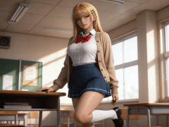 cosplay参考图中的人物,摆出帅气姿势,写实风格,写真风格,东方韵味,神性美感,建模3d皮肤,次表面散射,皮肤光泽感强,水润通透,精细的皮肤纹理,精细的衣服纹理,白嫩皮肤,美白滤镜,真人3d建模脸,超高分辨率,全身女,ue5建模,高细节,电影级特效,高挑修长,3d动画渲染,景深。高饱和,反射,折射,肌理质感。大片高级感,电影美学,大师杰作。CGI,虚幻引擎5渲染,oc渲染。白色长袖衬衫,领口为标准翻领设计,前襟有纽扣,部分纽扣未扣,露出内层绿色内衣;领结为红色蝴蝶结,系于胸前,蝴蝶结宽大且有光泽感;外搭米色针织开衫,开衫为长袖设计,前襟有圆形纽扣,下摆自然垂落;下身穿着深蓝色百褶短裙,裙摆整齐,长度及大腿中部,裙边有浅蓝色条纹装饰;脚穿白色中筒袜,袜口整齐,搭配黑色皮鞋;头发用黑色发夹固定,发夹呈细长条状,耳垂佩戴黑色小耳钉。整体为日式高中女生校服风格,清新自然,色彩以白、蓝、红、米为主,线条简洁。高细节,清晰线条,光影柔和。