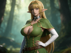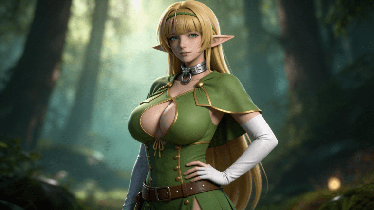 cosplay参考图中的人物,摆出帅气姿势,写实风格,写真风格,东方韵味,神性美感,建模3d皮肤,次表面散射,皮肤光泽感强,水润通透,精细的皮肤纹理,精细的衣服纹理,白嫩皮肤,美白滤镜,真人3d建模脸,超高分辨率,全身女,ue5建模,高细节,电影级特效,高挑修长,3d动画渲染,景深。高饱和,反射,折射,肌理质感。大片高级感,电影美学,大师杰作。CGI,虚幻引擎5渲染,oc渲染。绿色紧身短袖上衣,材质为布料质感,表面有轻微光泽;胸前为深V领口设计,边缘有金色包边装饰,形成交叉绑带结构;肩部有宽大披肩式设计,披肩自然垂落,边缘有金色滚边;颈部佩戴银色金属项圈,项圈中央有圆形环扣,环扣可活动;下身穿着绿色短裙,裙摆较短,长度及大腿中部,裙身有金色纽扣与绑带装饰;双臂佩戴白色长手套,手套长度至肘部,手背处有自然褶皱;腰部系有棕色皮质腰带,腰带上有金属铆钉装饰;头戴绿色发带,发带呈细条状,贴合发际线。整体为奇幻精灵风格女性战斗服,融合森林元素与哥特元素,色彩以绿、金、白为主,视觉华丽且富有层次感。高细节,清晰线条,光影柔和。