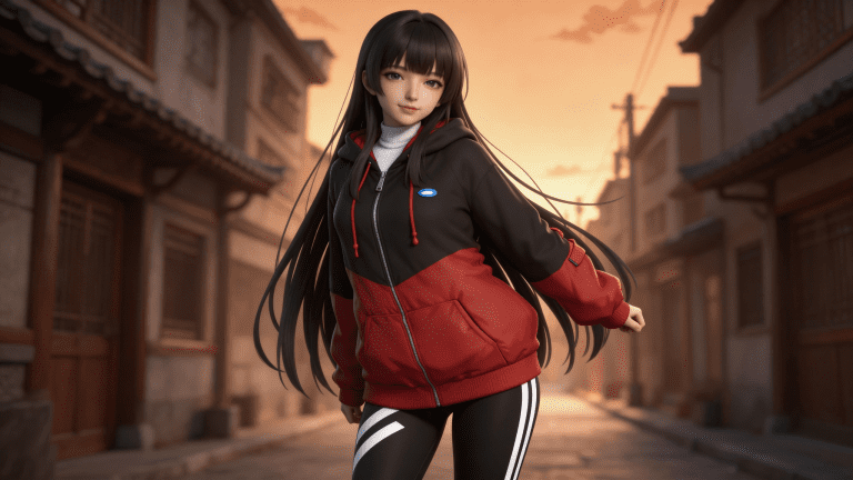 cosplay参考图中的人物,摆出帅气姿势,写实风格,写真风格,东方韵味,神性美感,建模3d皮肤,次表面散射,皮肤光泽感强,水润通透,精细的皮肤纹理,精细的衣服纹理,白嫩皮肤,美白滤镜,真人3d建模脸,超高分辨率,全身女,ue5建模,高细节,电影级特效,高挑修长,3d动画渲染,景深。高饱和,反射,折射,肌理质感。大片高级感,电影美学,大师杰作。CGI,虚幻引擎5渲染,oc渲染。红黑拼色连帽外套,材质为厚实棉质面料,表面有轻微光泽感;上半部分为黑色,下半部分为红色,颜色分界清晰;拉链为银色金属拉链,从领口延伸至下摆,拉链完全拉合;帽子为连帽设计,帽绳为红色,末端有小球装饰;胸前左侧有一个蓝色圆形徽章,徽章边缘有白色描边;袖口和下摆为罗纹收口设计,增强贴合感;内搭白色高领毛衣,毛衣材质柔软,贴身舒适;下身穿着黑色紧身运动裤,裤腿两侧有两条平行白色条纹,条纹清晰且对称;整体为现代休闲运动风穿搭,色彩以红、黑、白为主,线条简洁。高细节,清晰线条,光影柔和。