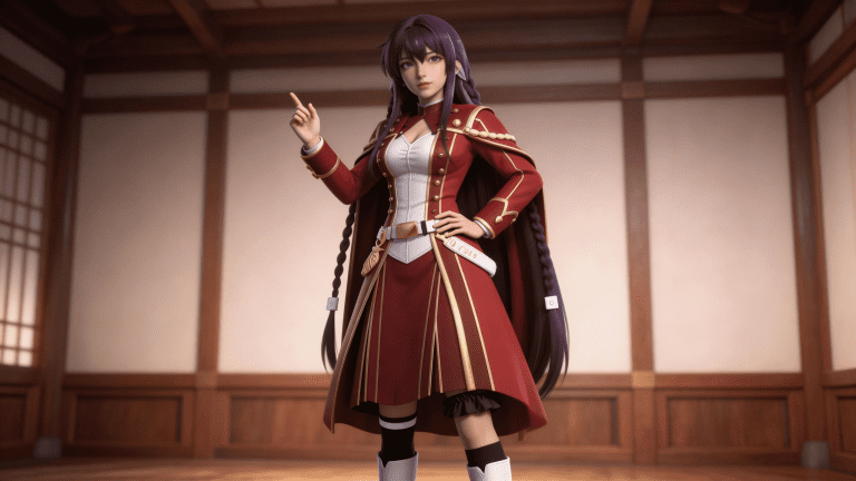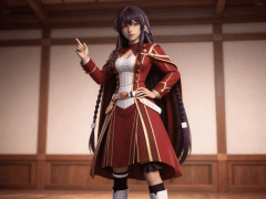 cosplay参考图中的人物,摆出帅气姿势,写实风格,写真风格,东方韵味,神性美感,建模3d皮肤,次表面散射,皮肤光泽感强,水润通透,精细的皮肤纹理,精细的衣服纹理,白嫩皮肤,美白滤镜,真人3d建模脸,超高分辨率,全身女,ue5建模,高细节,电影级特效,高挑修长,3d动画渲染,景深。高饱和,反射,折射,肌理质感。大片高级感,电影美学,大师杰作。CGI,虚幻引擎5渲染,oc渲染。深红色长款军装式外套,材质为厚实布料,表面有光泽感;外套为双排扣设计,前襟有金色纽扣,纽扣排列整齐;肩部有宽大披风式设计,披风自然垂落,边缘有金色滚边装饰;袖口为翻边设计,袖口处有金色条纹与金属扣环;内搭白色紧身束胸衣,束胸衣为V领设计,胸前有立体剪裁,突出曲线;腰部系有白色宽腰带,腰带中央有金色金属扣环,腰带两侧有流苏状装饰;裙摆为A字型设计,长度及小腿中部,裙身有多条垂直金色线条装饰,增强层次感;下身穿着黑色短裤,短裤外露部分有褶皱处理;腿部佩戴黑色长筒袜,袜口处有白色装饰条;整体为奇幻贵族风格女性战服,融合宫廷与军事元素,色彩以红、金、白为主,视觉华丽且富有威严感。高细节,清晰线条,光影柔和。