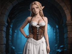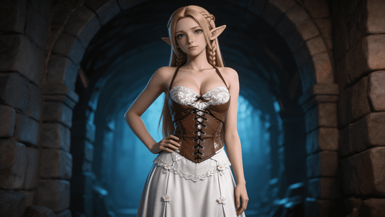 cosplay参考图中的人物,摆出帅气姿势,写实风格,写真风格,东方韵味,神性美感,建模3d皮肤,次表面散射,皮肤光泽感强,水润通透,精细的皮肤纹理,精细的衣服纹理,白嫩皮肤,美白滤镜,真人3d建模脸,超高分辨率,全身女,ue5建模,高细节,电影级特效,高挑修长,3d动画渲染,景深。高饱和,反射,折射,肌理质感。大片高级感,电影美学,大师杰作。CGI,虚幻引擎5渲染,oc渲染。白色蕾丝吊带连衣裙,材质为轻盈布料,表面有细腻花纹;上半身为深V领口设计,胸前有立体花朵刺绣装饰,边缘有蕾丝花边;外搭棕色皮革束腰马甲,马甲为前襟系带式设计,黑色细绳交叉绑紧,配以金属孔眼;马甲两侧有自然褶皱,增强立体感;下半身裙摆为A字型设计,长度及小腿中部,裙身有多层褶皱与小花结装饰,体现古典优雅;袖口为无袖设计,肩带为细吊带结构;整体为奇幻精灵风格女性礼服,融合中世纪与森林元素,色彩以白、棕、金为主,视觉柔和且富有层次感。高细节,清晰线条,光影柔和。