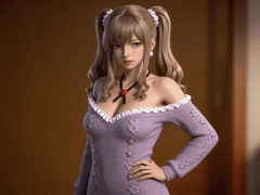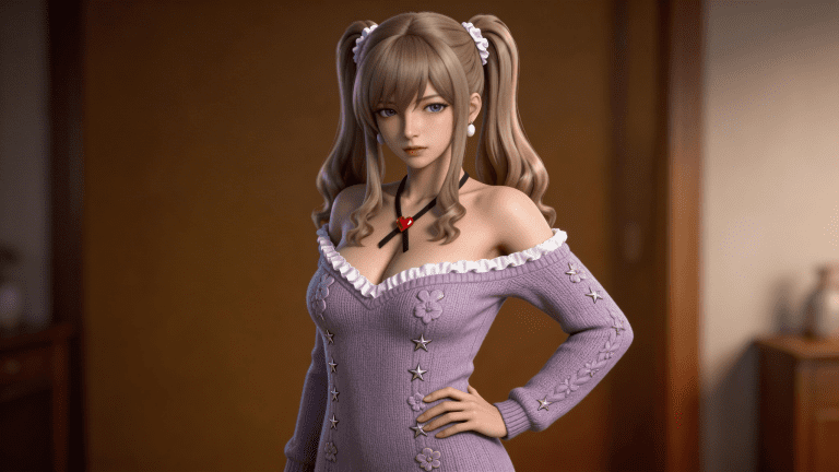 cosplay参考图中的人物,摆出帅气姿势,写实风格,写真风格,东方韵味,神性美感,建模3d皮肤,次表面散射,皮肤光泽感强,水润通透,精细的皮肤纹理,精细的衣服纹理,白嫩皮肤,美白滤镜,真人3d建模脸,超高分辨率,全身女,ue5建模,高细节,电影级特效,高挑修长,3d动画渲染,景深。高饱和,反射,折射,肌理质感。大片高级感,电影美学,大师杰作。CGI,虚幻引擎5渲染,oc渲染。浅紫色露肩针织连衣裙,材质为柔软毛线,表面有细腻纹理;领口为宽大V形设计,边缘有白色花边装饰,整体呈自然垂落感;胸前有黑色细带交叉系结,系结中央镶嵌一颗红色爱心形吊坠,吊坠反光明显;裙身布满小星星与花朵刺绣图案,图案精致且分布均匀;袖口为无袖设计,肩部自然外露;整体为日式可爱风格女性家居服,融合少女与梦幻元素,色彩以紫、白、红为主,视觉柔和且富有层次感。高细节,清晰线条,光影柔和。