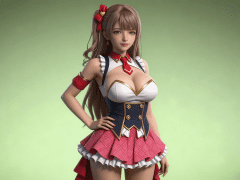cosplay参考图中的人物,摆出帅气姿势,写实风格,写真风格,东方韵味,神性美感,建模3d皮肤,次表面散射,皮肤光泽感强,水润通透,精细的皮肤纹理,精细的衣服纹理,白嫩皮肤,美白滤镜,真人3d建模脸,超高分辨率,全身女,ue5建模,高细节,电影级特效,高挑修长,3d动画渲染,景深。高饱和,反射,折射,肌理质感。大片高级感,电影美学,大师杰作。CGI,虚幻引擎5渲染,oc渲染。粉红色格纹短裙套装,材质为柔软布料,表面有光泽感;上衣为白色抹胸式设计,边缘有金色线条装饰,胸前呈V形收拢,突出胸部轮廓;外搭深蓝色马甲,马甲为前襟双排扣设计,纽扣为金色圆形,中央有菱形镂空图案;马甲领口为立领设计,领口处有红色翻边装饰,搭配红色领结,领结宽大且对称;肩部有白色荷叶边装饰,肩带为黑色细带,自然垂落;下身穿着粉红色格纹短裙,裙摆为A字型设计,长度及大腿中部,裙身有多层褶皱,底部边缘有白色花边包边;整体为日式可爱风格女性女仆装,融合校园与幻想元素,色彩以粉、白、红、蓝为主,视觉活泼且富有层次感。高细节,清晰线条,光影柔和。